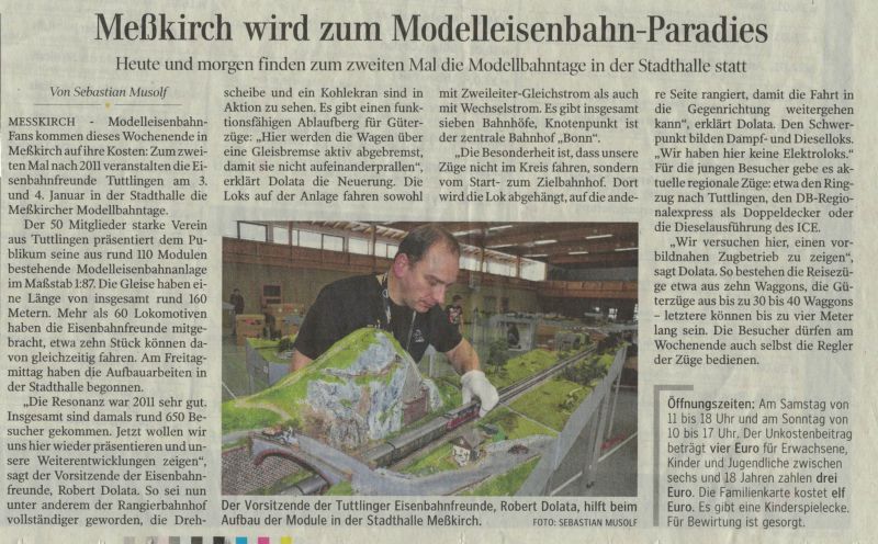 Meßkirch/sz "Zum zweiten Mal nach 2011 haben die Eisenbahnfreunde Tuttlingen zu den Meßkircher Modellbahntagen eingeladen. Die Stadthalle hat sich an diesem Wochenende zu einer großen Spielwiese für große und kleine Modelleisenbahn-Fans verwandelt. Dampf- und Diesellok-Modelle fahren an Sägewerken, einer sich drehenden Windmühle und Badegästen, die sich unter einer Brücke im Wasser vergnügen, vorbei. Überall gibt es liebenswerte Details zu entdecken."